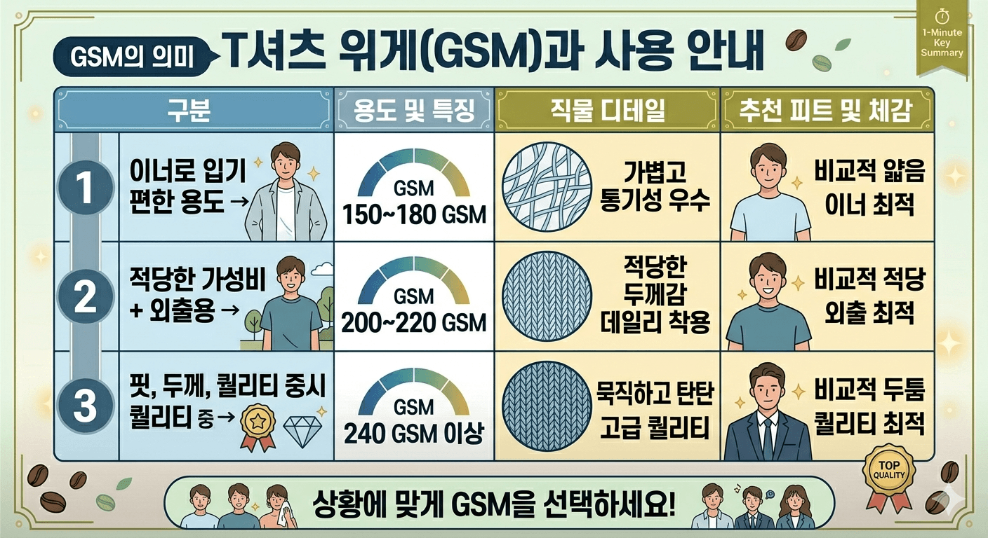 처음에는 GSM을 그냥 숫자로만 봤는데, 직접 찾아보고 매장에 가서 손으로 만지면서 느끼고 입어보니까 이건 거의 “용도 선택 기준”에 가깝다이다.